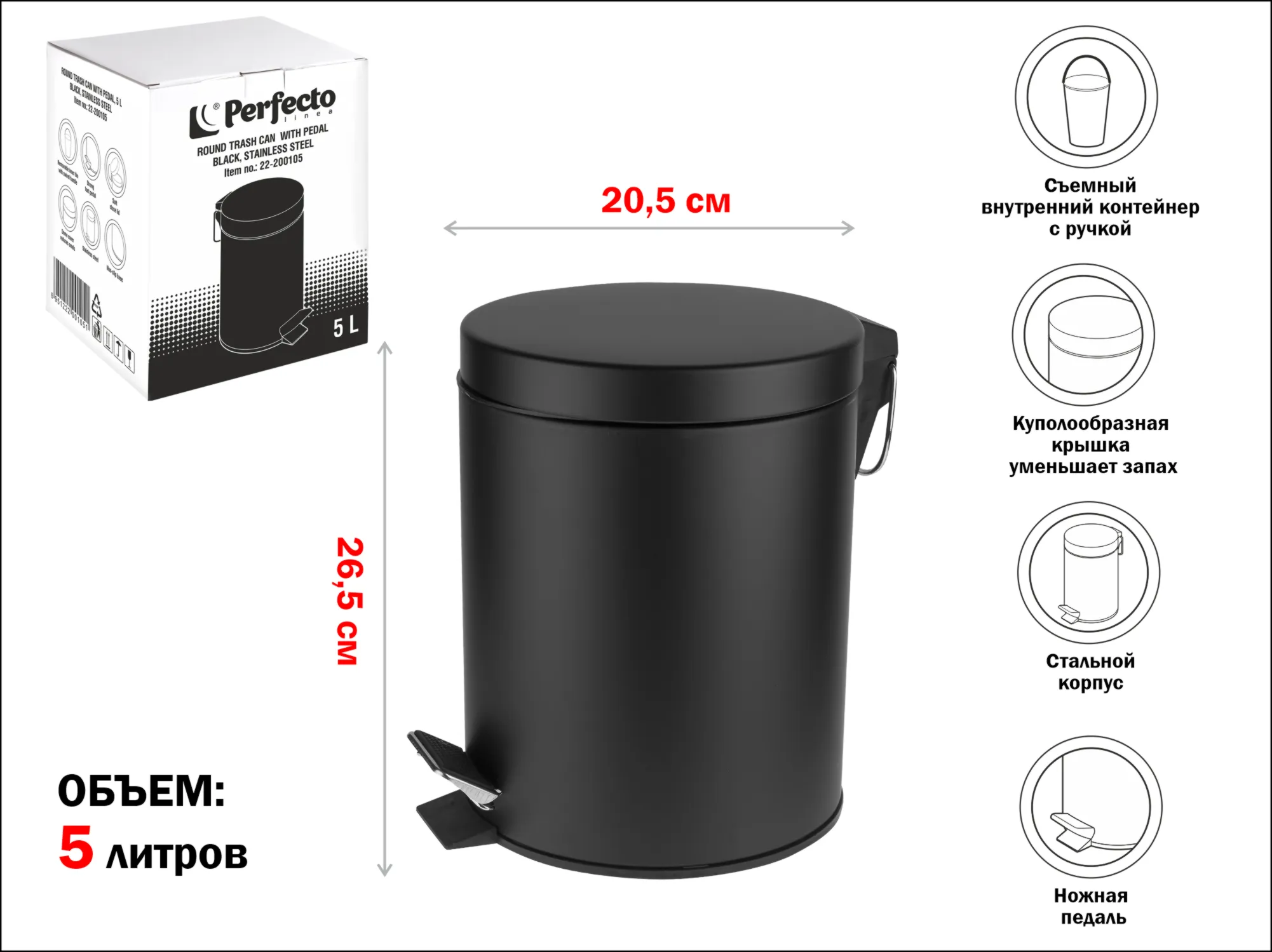 Ведро для мусора с педалью, 5 л, черное, нержавеющая сталь, PERFECTO LINEA