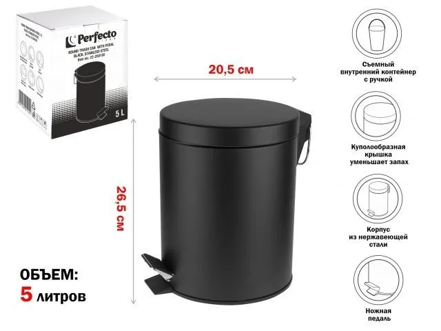 Ведро для мусора с педалью, 5 л, черное, сталь, PERFECTO LINEA