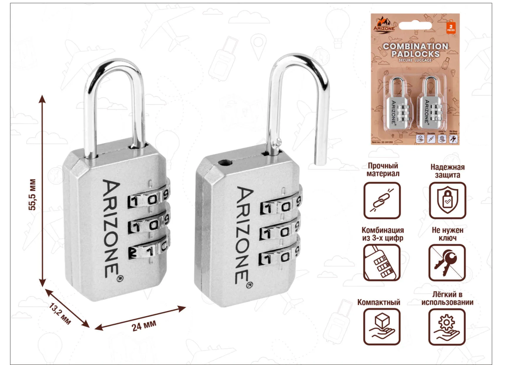 Замок навесной кодовый багажный, 2 штуки, серебро, ARIZONE