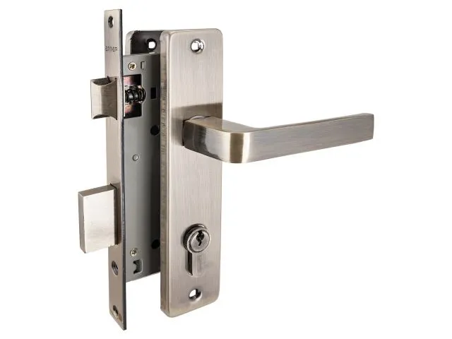 Замок врезной с комплектом ручек на планке. Предназначен для установки в деревянные двери толщиной 35 - 40 мм, правого и левого открывания.