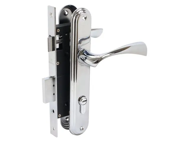 Замок врезной с комплектом ручек на планке. Предназначен для установки в деревянные двери толщиной 35 - 38 мм, правого и левого открывания. Материал ручки - цинковый сплав ЦАМ. Материал планки - сталь. Покрытие комплекта ручек: гальваническое, многослойное.