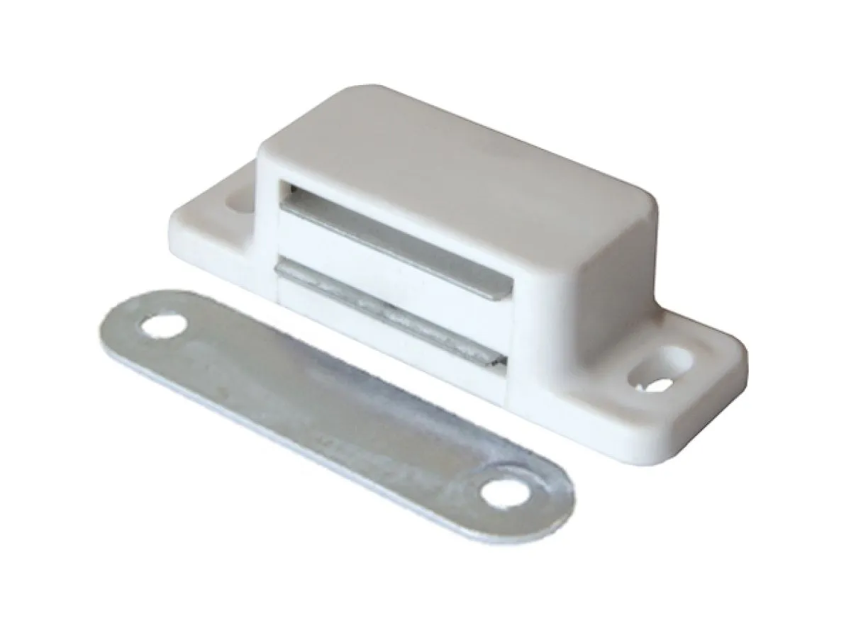 Магнитный фиксатор устанавливается на корпус мебели, а к внутренней стороне створки прикрепляется металлическая планка.
