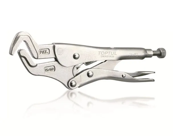 Зажим-клещи с изогнутыми узкими губками TOPTUL идеально фиксируется на трубах и прочих деталях цилиндрической формы благодаря насечкам на захватывающей поверхности и специальным образом изогнутым губкам. Инструмент имеет механизм регулировки ширины захвата и фиксатор. Рекомендуется для профессионального использования.
