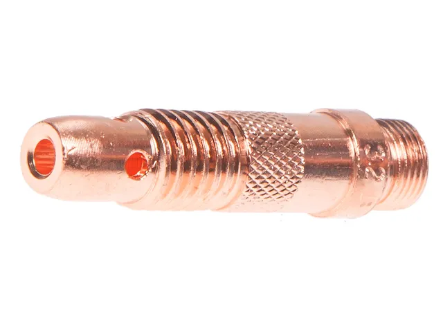 Зажим цанги является расходным элементом TIG горелки. Предназначен для фиксации электрода с цангой в TIG горелке. Отверстия на зажиме служат для распределения потока защитного газа.